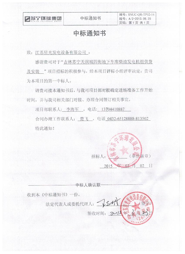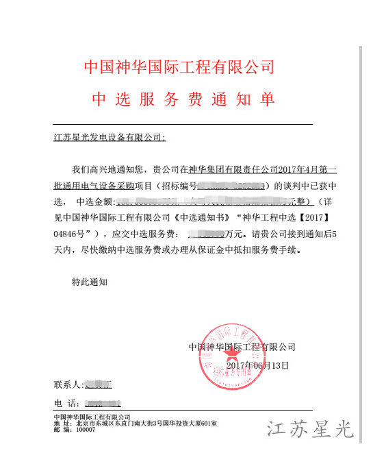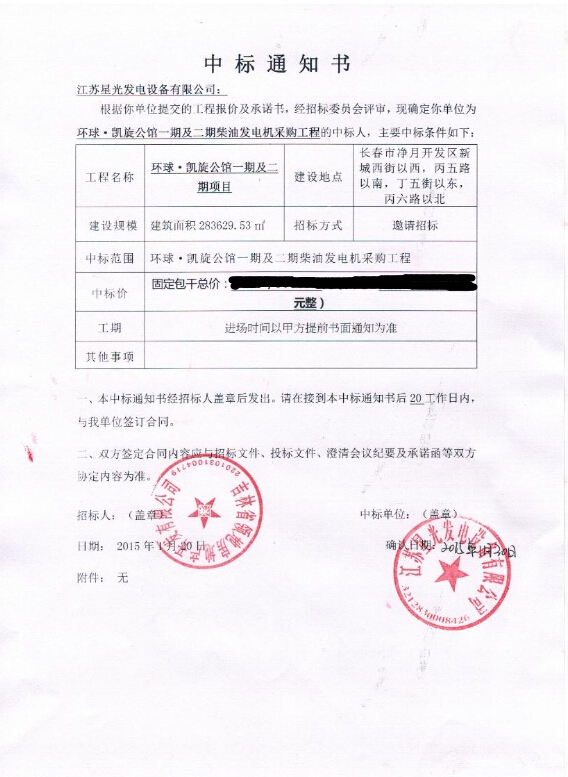 熱烈祝賀星光公司成功中標(biāo)中國解放軍某部隊(duì)后勤保障部500kw柴油發(fā)..