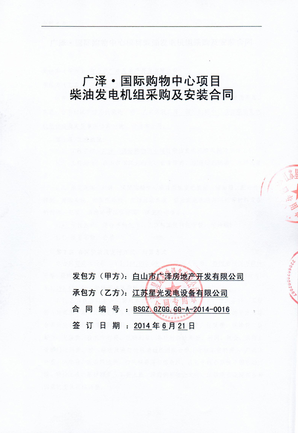 廣澤國際購物中心項(xiàng)目柴油發(fā)動(dòng)機(jī)組采購及安裝合同